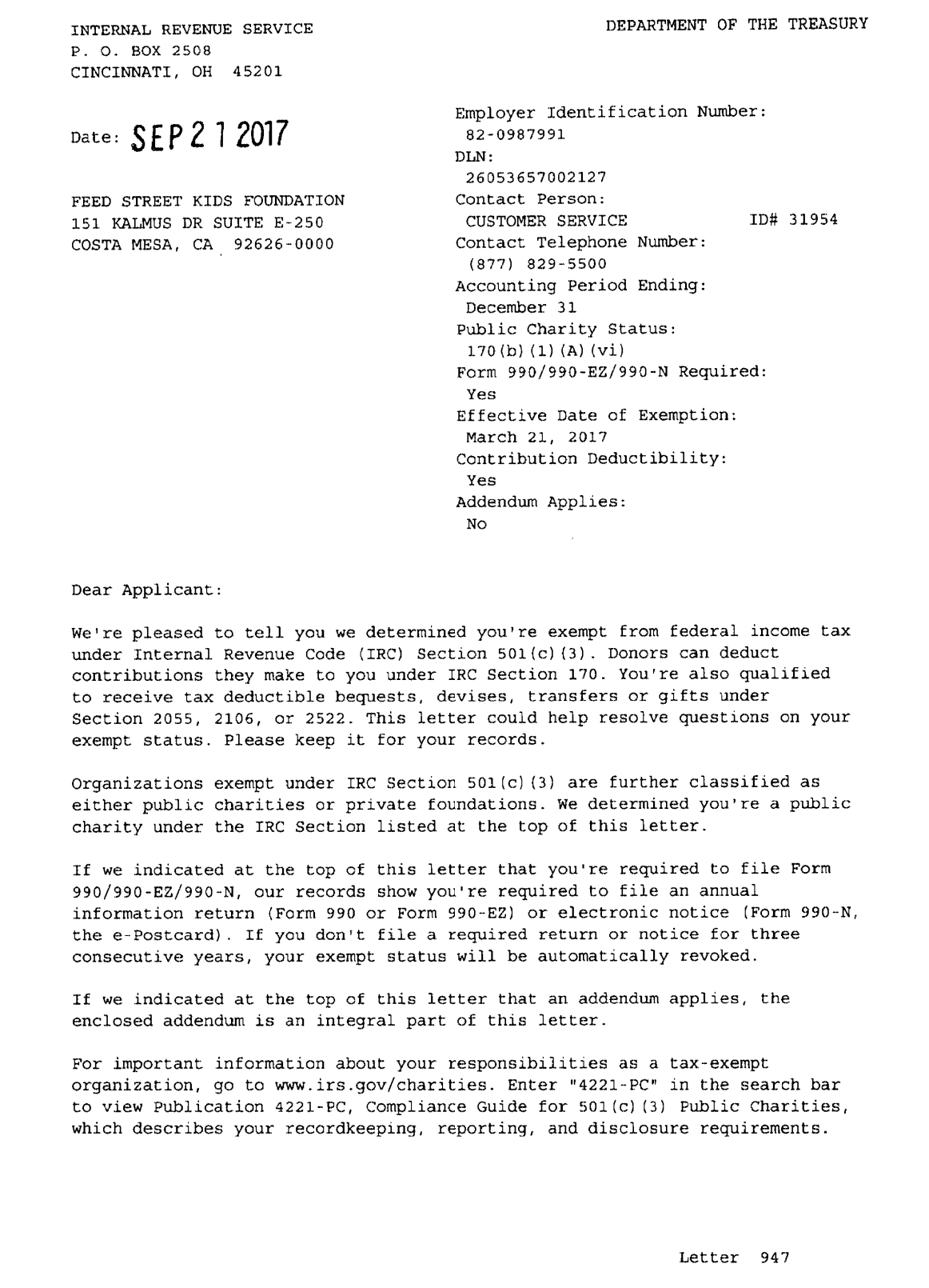 We are pleased to announce that Feed Street Kids Foundation has been granted tax-exempt status under Section 501(c)(3) of the Internal Revenue Code. This approval underscores our commitment to transparency and accountability, ensuring that your contributions are used effectively to support our mission.